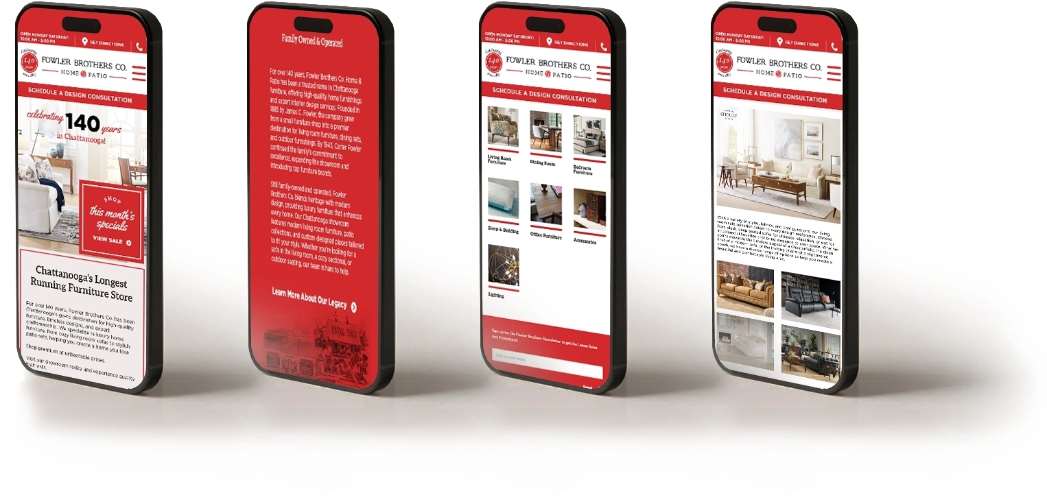 By enhancing their brand’s omnipresence across digital and physical platforms, our monthly campaigns have consistently delivered an average of 11,000 conversions per month. These include Google Ads engagement, phone calls, Google Business Profile direction requests, and click-to-call actions. We’ve significantly expanded Fowler Brothers’ reach on social media, drawing in customers from major surrounding markets like Nashville and Atlanta to their Chattanooga showroom. This strategic, multi-channel presence has helped secure multiple annual “Best of the Best” awards, further solidifying Fowler Brothers as a leading name in the regional furniture and interior design industry.